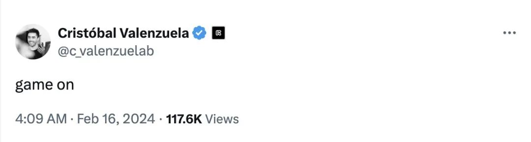 虽然在此之前视频生成已经是大模型领域最热门的研究方向之一,谷歌、Meta、Runway、百度、字节跳动等国内外公司都在积极布局,但截至目前,市场上尚未出现能够与Sora相抗衡的竞争对手。Sora走红后,视频生成赛道的领先者Runway公司CEO克里斯托瓦尔·巴伦苏埃拉在X平台上发布了一个简短的宣言:“Game On(比赛开始了)。”