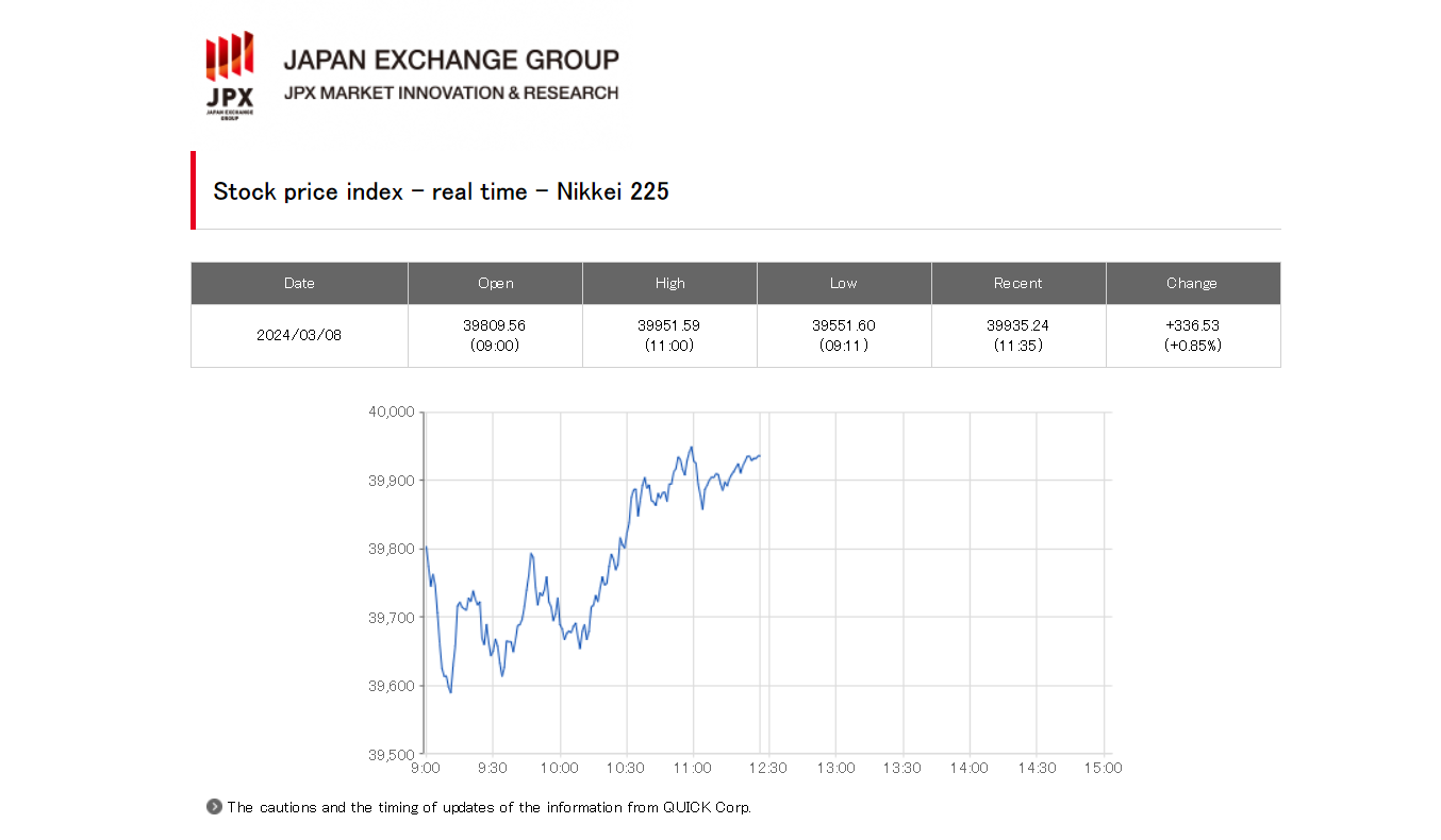 3月8日日经225指数的表现。(图源:日本交易所集团(JPX)官网截图)
