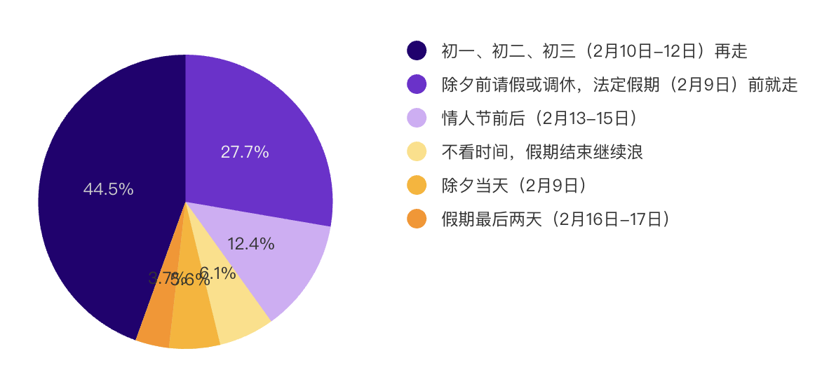 具体来看,根据此次调研数据,超60%的受访对象计划在春节假期安排5天至8天甚至更长时间的旅程。其中,选择在大年初一、初二、初三(2月10日—12日)出行的消费者占比最多,为44.5%;计划除夕前请假或调休,率先出门的消费者占比为27.7%。