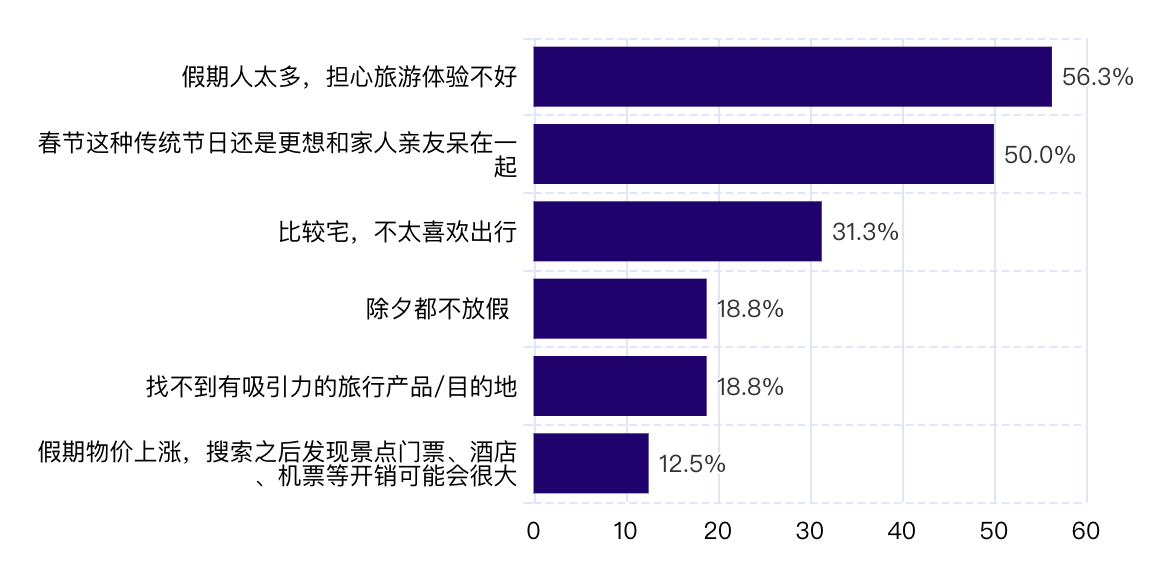 不过,也有不少人认为,春节是我国传统节假日,更愿意陪伴在亲朋好友身边。此外,对不愿出门的消费者来说,除了想和家人团聚,担心假期游客过多影响出游体验也是导致他们春节“宅家”的重要原因之一。