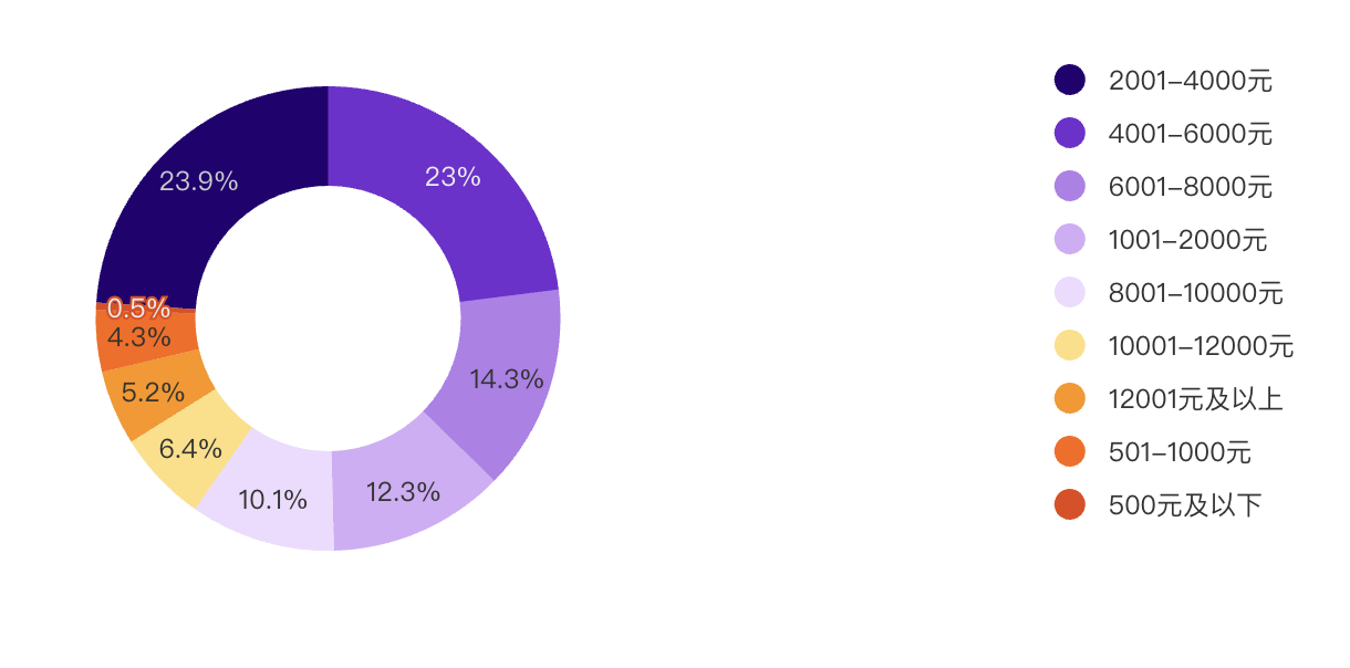 从本次统计数据来看,2024年春节假期,约五成以上受访对象预估人均花费接近2001元—6000元。其中,预估人均消费在2001元—4000元的受访对象占比最高,为23.9%;预估人均消费4001元—6000元的受访对象占比为23%;预估人均消费在6001元—8000元的受访对象占比为14.3%;预估人均消费过万的受访者约为11.6%。
