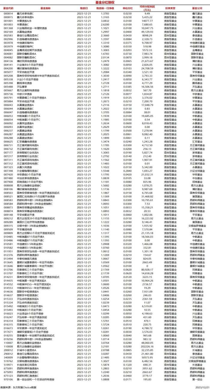 南方财经12月21日电,据东方财富Choice数据统计,今日共有101只基金分红除权(A/C类分开计算),包括93只债券型基金、8只混合型基金,累计可供分配利润100.08亿元。